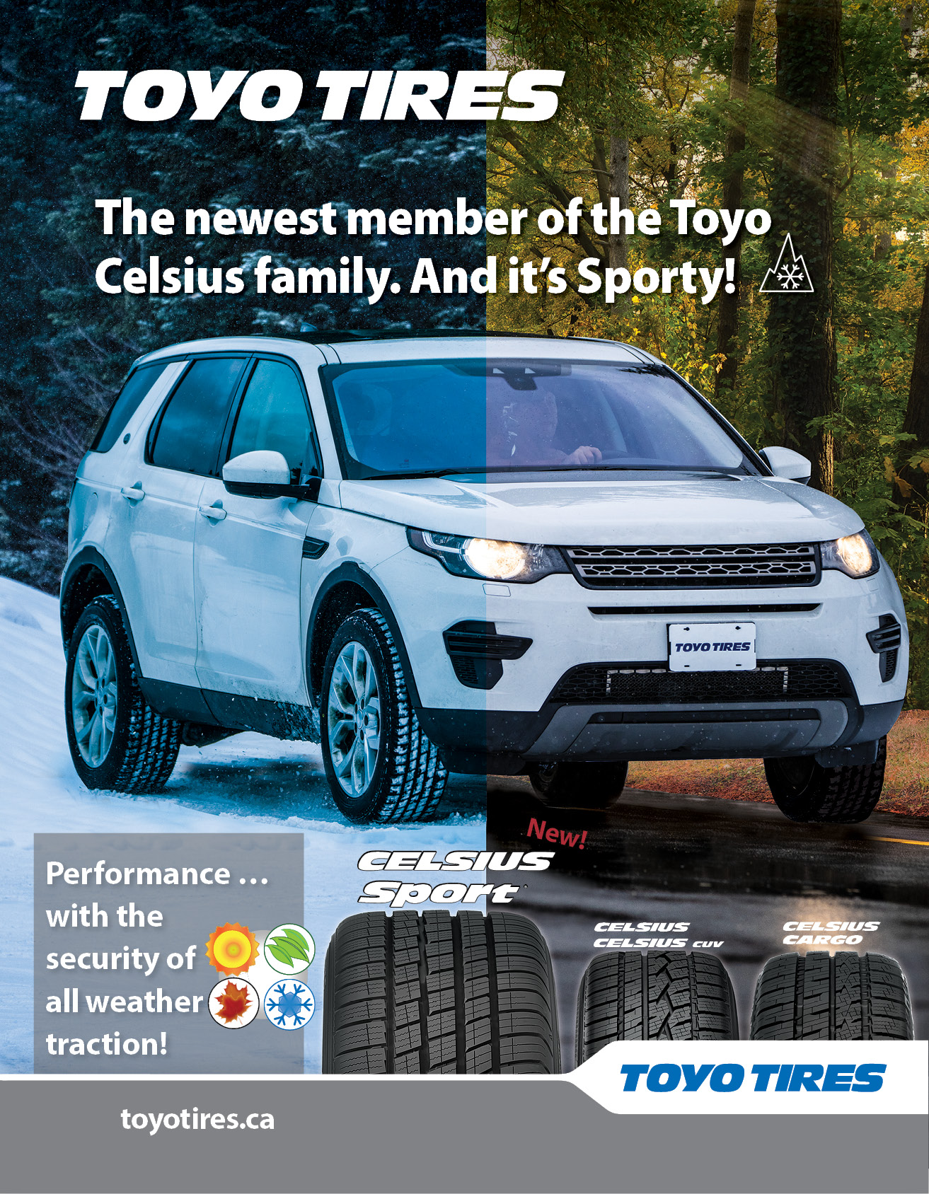 The Celsius Sport is designed to maintain the performance characteristics owners of luxury cars, SUVs, and CUVs demand yet with the added traction required in changing weather conditions. The three-peak mountain snowflake symbol designates its capability in snow, slush, and ice for true all weather performance. Spirited drivers seeking performance upgrade will appreciate the refined looks, precise handling, and driving comfort and all weather traction of the Celsius Sport.